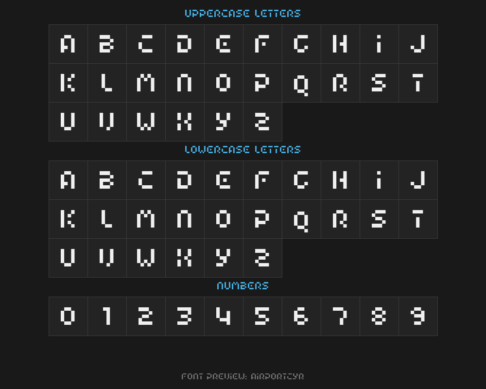 airportcyr is a font file with a size of 0.10 MB. The full font name is Airport Cyr, Version 1.1; 2001 version. It contains 263 characters, supports 8 Chinese characters. The copyright belongs to Airport Cyr. airportcyr font is available for free download, but commercial use requires confirmation on the Airport Cyr official website whether it's free for commercial use.
