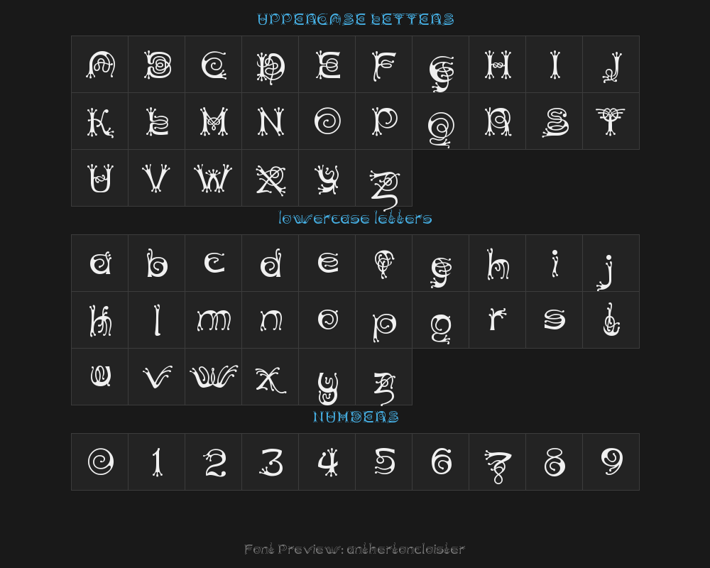 anthertoncloister is a font file with a size of 0.08 MB. The full font name is Antherton Cloister, Macromedia Fontographer 4.1.5 8 22 03 version. It contains 253 characters, supports 8 Chinese characters. The copyright belongs to Antherton Cloister. anthertoncloister font is available for free download, but commercial use requires confirmation on the Antherton Cloister official website whether it's free for commercial use.