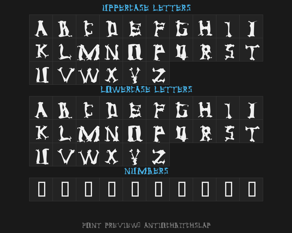 antiochbitchslap is a font file with a size of 0.03 MB. The full font name is Antioch Bitchslap, Macromedia Fontographer 4.1 1 10 00 version. It contains 53 characters, supports 8 Chinese characters. The copyright belongs to Antioch Bitchslap. antiochbitchslap font is available for free download, but commercial use requires confirmation on the Antioch Bitchslap official website whether it's free for commercial use.