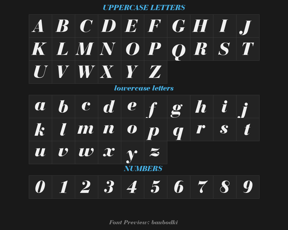 baubodki is a font file with a size of 0.05 MB. The full font name is Bauer Bodoni Black Italic BT, mfgpctt-v1.52 Tuesday, January 26, 1993 9 31 14 am (EST) version. It contains 257 characters, supports 8 Chinese characters. The copyright belongs to BauerBodni Blk BT. baubodki font is available for free download, but commercial use requires confirmation on the BauerBodni Blk BT official website whether it's free for commercial use.