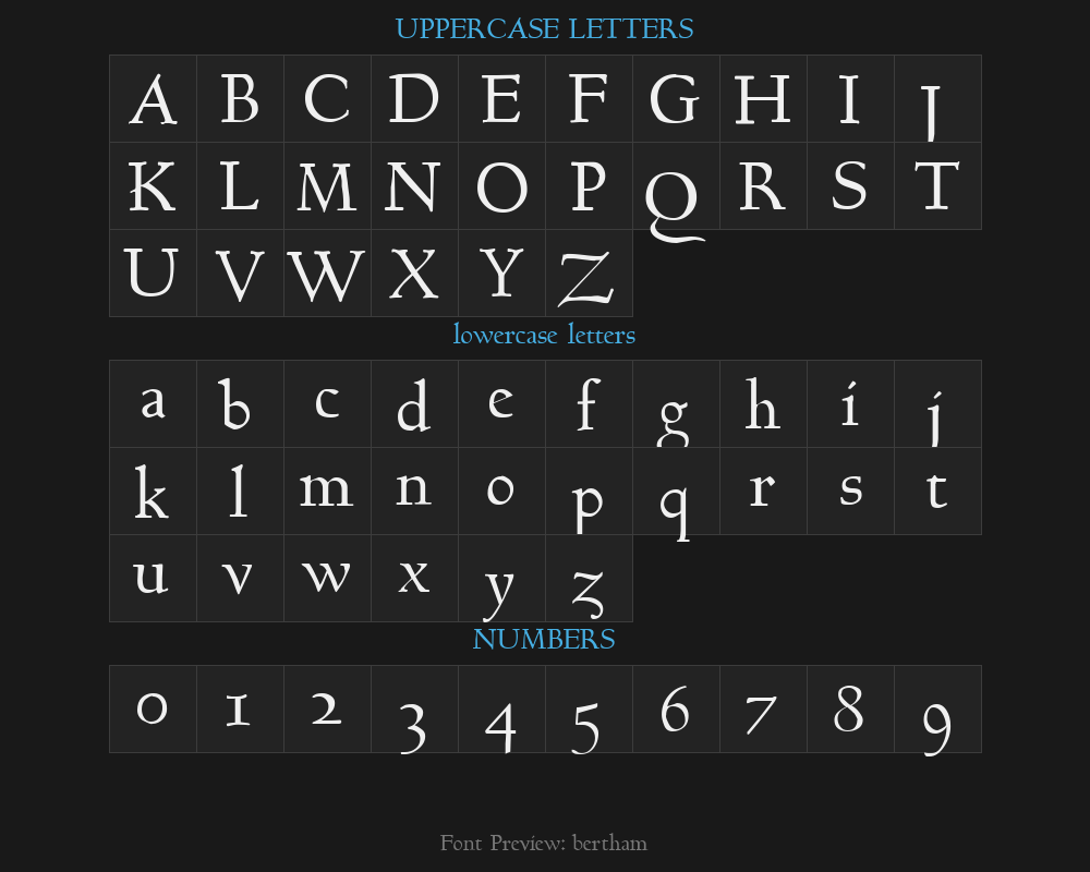 bertham is a font file with a size of 0.05 MB. The full font name is Bertham, 001.003 version. It contains 224 characters, supports 8 Chinese characters. The copyright belongs to Bertham. bertham font is available for free download, but commercial use requires confirmation on the Bertham official website whether it's free for commercial use.