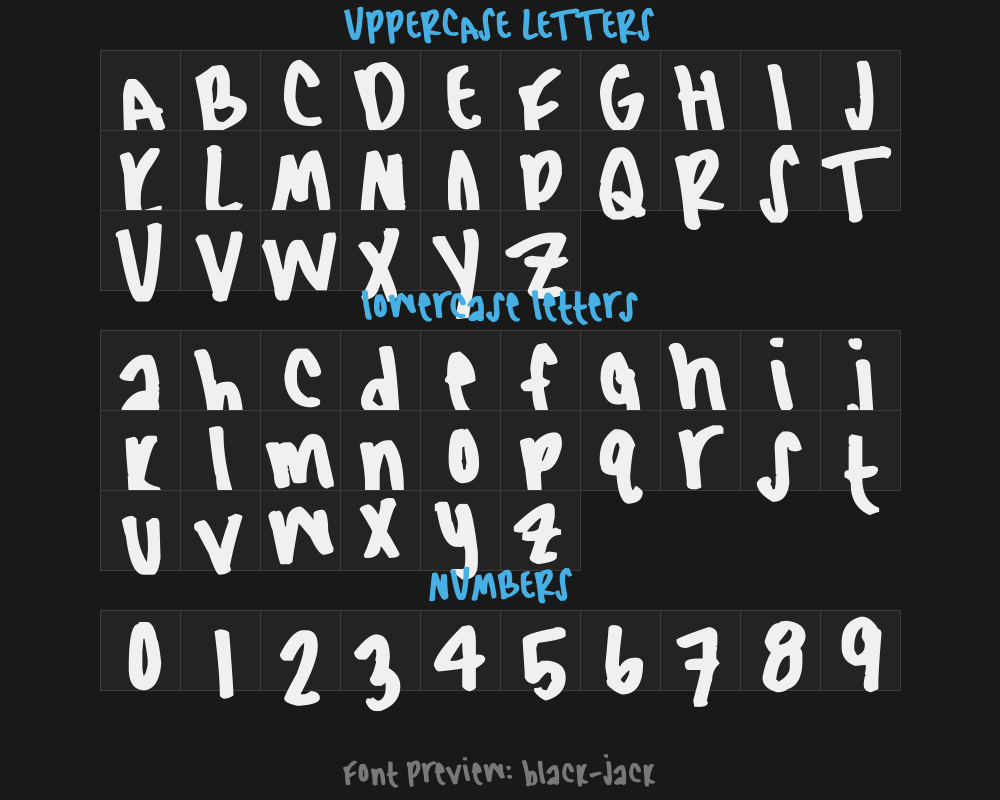 black-jack is a font file with a size of 0.02 MB. The full font name is black jack, Version 1.00 November 4, 2013, initial release version. It contains 128 characters, supports 8 Chinese characters. The copyright belongs to black jack. black-jack font is available for free download, but commercial use requires confirmation on the black jack official website whether it's free for commercial use.