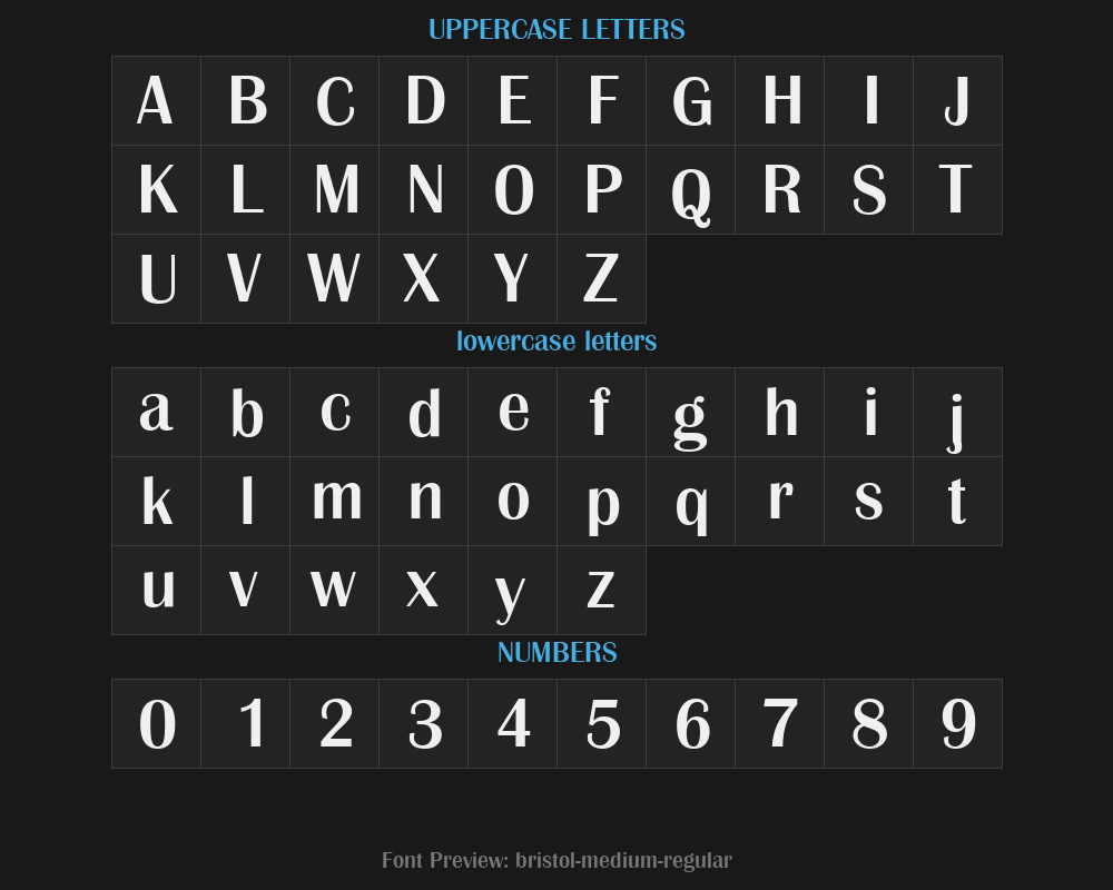 bristol-medium-regular is a font file with a size of 0.16 MB. The full font name is Bristol-Medium-Regular, Version 1.0 08-10-2002 version. It contains 550 characters, supports 8 Chinese characters. The copyright belongs to Bristol-Medium. bristol-medium-regular font is available for free download, but commercial use requires confirmation on the Bristol-Medium official website whether it's free for commercial use.