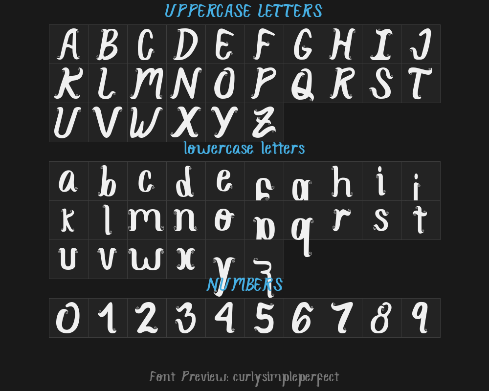 curlysimpleperfect is a font file with a size of 0.11 MB. The full font name is CurlySimplePerfect, 1.0 version. It contains 216 characters, supports 8 Chinese characters. The copyright belongs to CurlySimplePerfect. curlysimpleperfect font is available for free download, but commercial use requires confirmation on the CurlySimplePerfect official website whether it's free for commercial use.