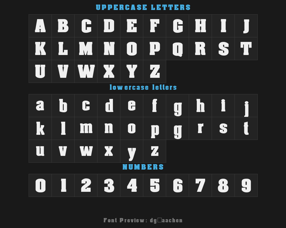 dg_aachen is a font file with a size of 0.03 MB. The full font name is DG_Aachen, 1.0 Thu Jun 17 19 44 37 1993 version. It contains 162 characters, supports 8 Chinese characters. The copyright belongs to DG_Aachen. dg_aachen font is available for free download, but commercial use requires confirmation on the DG_Aachen official website whether it's free for commercial use.