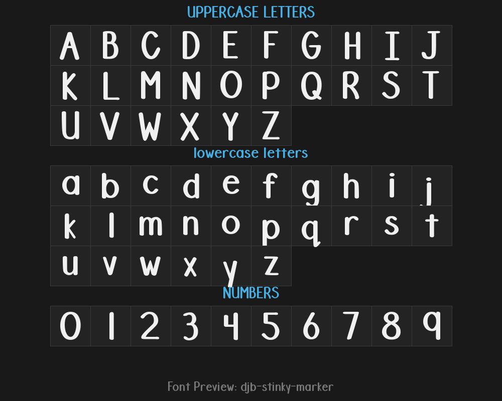djb-stinky-marker is a font file with a size of 0.04 MB. The full font name is DJB Stinky Marker, Version 1.00 August 21, 2015, initial release version. It contains 385 characters, supports 8 Chinese characters. The copyright belongs to DJB Stinky Marker. djb-stinky-marker font is available for free download, but commercial use requires confirmation on the DJB Stinky Marker official website whether it's free for commercial use.