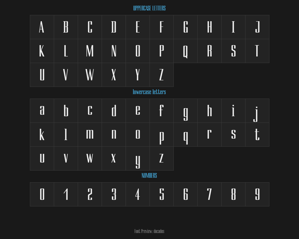 ducados is a font file with a size of 0.05 MB. The full font name is Ducados, Version 001.001 version. It contains 321 characters, supports 8 Chinese characters. The copyright belongs to Ducados. ducados font is available for free download, but commercial use requires confirmation on the Ducados official website whether it's free for commercial use.