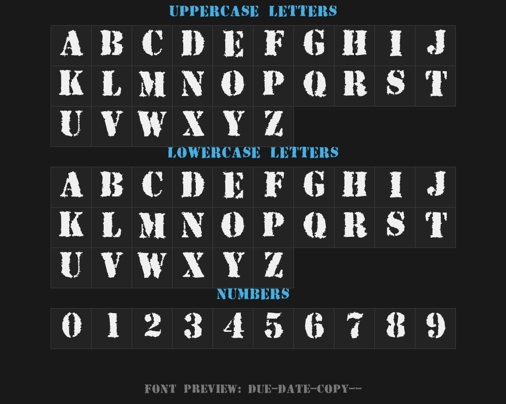 due-date-copy-2- is a font file with a size of 0.15 MB. The full font name is Due Date, 2.47 version. It contains 159 characters, supports 8 Chinese characters. The copyright belongs to Due Date. due-date-copy-2- font is available for free download, but commercial use requires confirmation on the Due Date official website whether it's free for commercial use.