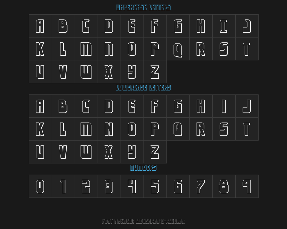 eldebaran-3d-regular is a font file with a size of 0.07 MB. The full font name is Eldebaran 3D Regular, 001.000 version. It contains 216 characters, supports 8 Chinese characters. The copyright belongs to Eldebaran 3D. eldebaran-3d-regular font is available for free download, but commercial use requires confirmation on the Eldebaran 3D official website whether it's free for commercial use.