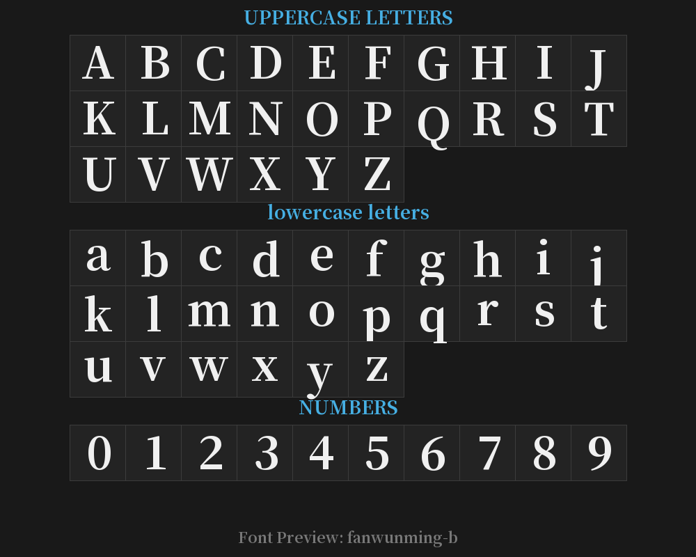 | Font information4 | Fan Wun Ming was designed by Ayaka MIKAZUKI. The font is derived from GenYoMin TW. designed by ButTaiwan. GenYoMin TW is derived from Source Han Serif, designed by Ryoko NISHIZUKA kana & ideographs; Frank Grießhammer (Latin, Greek & Cyrillic); Wenlong ZHANG (bopomofo) Sandoll Communications 산돌커뮤니케이션, Soohyun PARK 박수현, Yejin WE 위예진 & Donghoon HAN 한동훈 (hangul elements) letters & syllables). |