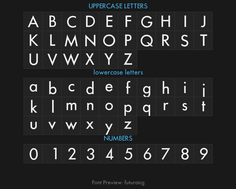 futuraicg is a font file with a size of 0.02 MB. The full font name is FuturaICG, 001.000 version. It contains 203 characters, supports 8 Chinese characters. The copyright belongs to FuturaICG. futuraicg font is available for free download, but commercial use requires confirmation on the FuturaICG official website whether it's free for commercial use.