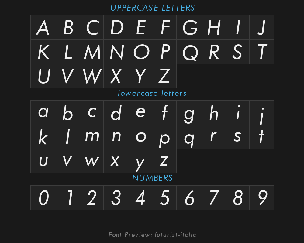 futurist-italic is a font file with a size of 0.04 MB. The full font name is Futurist Italic, (C)opyright 1992 W.S.I. 8 6 92 version. It contains 235 characters, supports 8 Chinese characters. The copyright belongs to Futurist. futurist-italic font is available for free download, but commercial use requires confirmation on the Futurist official website whether it's free for commercial use.