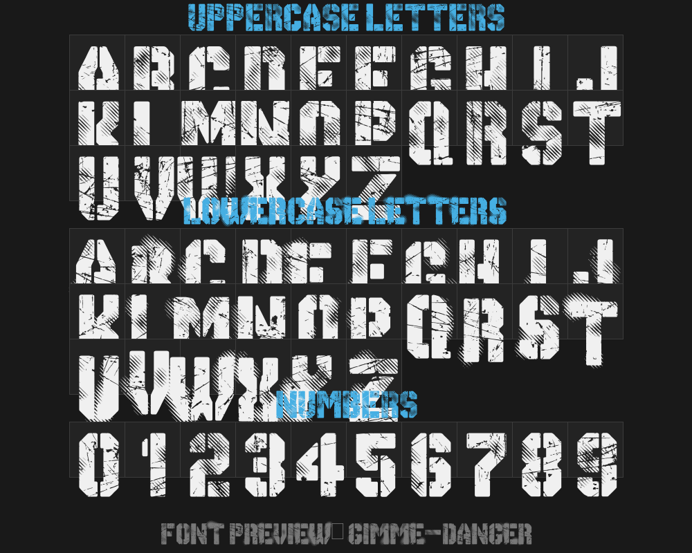 gimme-danger is a font file with a size of 0.14 MB. The full font name is Gimme Danger, 1.0 version. It contains 71 characters, supports 8 Chinese characters. The copyright belongs to Gimme Danger. gimme-danger font is available for free download, but commercial use requires confirmation on the Gimme Danger official website whether it's free for commercial use.