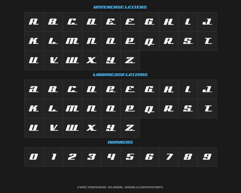 global-smallcapsscript is a font file with a size of 0.03 MB. The full font name is Global-SmallCapsScript, 001.000 version. It contains 243 characters, supports 8 Chinese characters. The copyright belongs to Global-SmallCapsScript. global-smallcapsscript font is available for free download, but commercial use requires confirmation on the Global-SmallCapsScript official website whether it's free for commercial use.