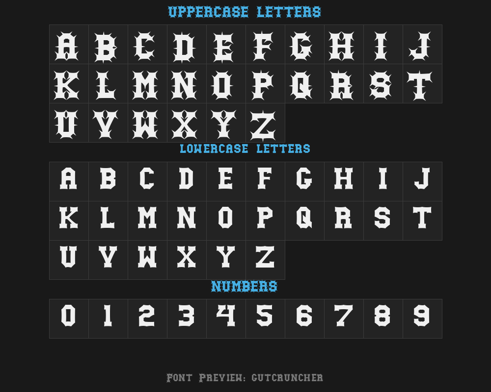 gutcruncher is a font file with a size of 0.04 MB. The full font name is Gutcruncher Normal, 1.0 version. It contains 96 characters, supports 8 Chinese characters. The copyright belongs to Gutcruncher. gutcruncher font is available for free download, but commercial use requires confirmation on the Gutcruncher official website whether it's free for commercial use.