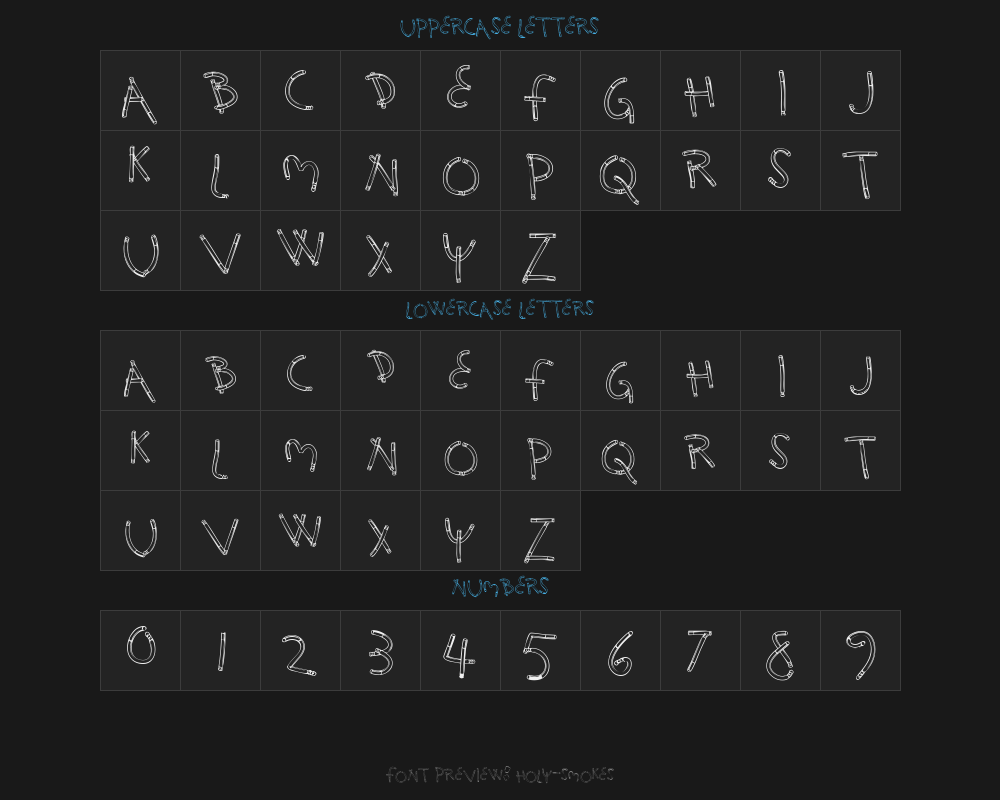 holy-smokes is a font file with a size of 0.06 MB. The full font name is Holy Smokes, Version 1.01 version. It contains 93 characters, supports 8 Chinese characters. The copyright belongs to Holy Smokes. holy-smokes font is available for free download, but commercial use requires confirmation on the Holy Smokes official website whether it's free for commercial use.
