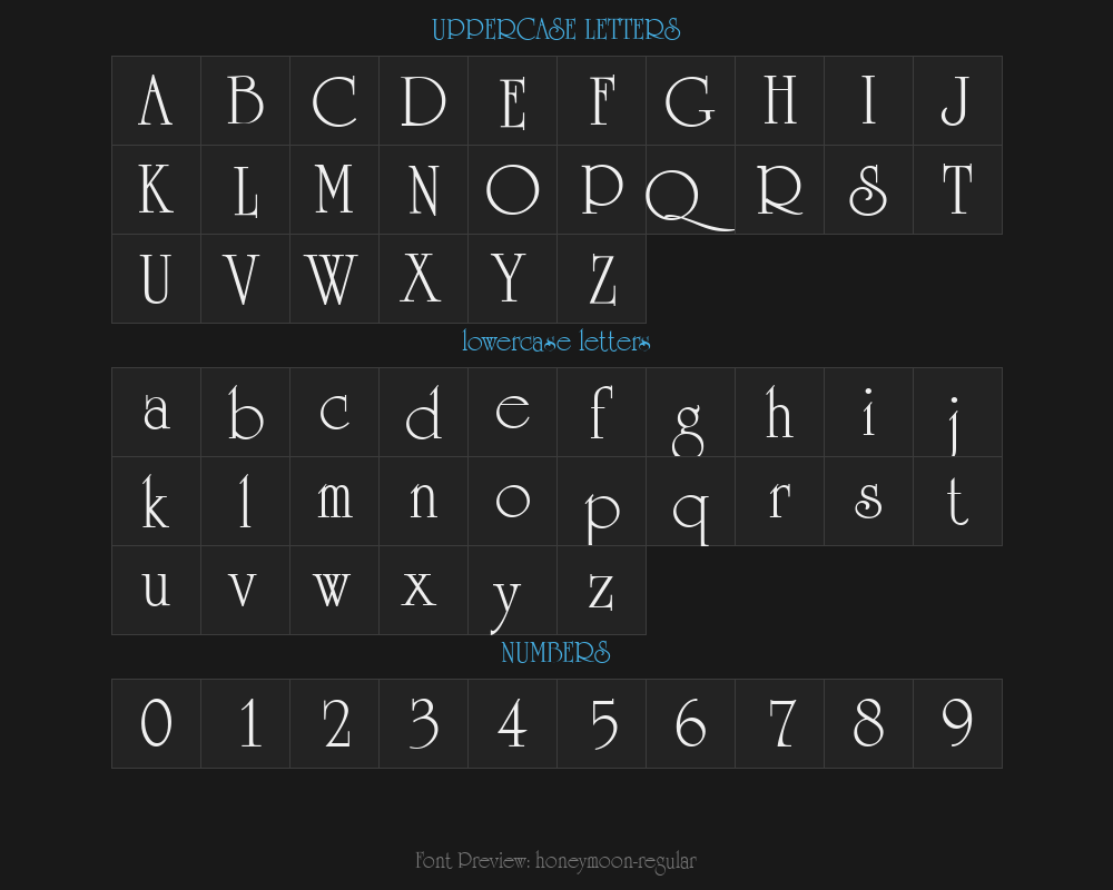 honeymoon-regular is a font file with a size of 0.18 MB. The full font name is Honeymoon-Regular, Version 1.0 08-10-2002 version. It contains 587 characters, supports 8 Chinese characters. The copyright belongs to Honeymoon. honeymoon-regular font is available for free download, but commercial use requires confirmation on the Honeymoon official website whether it's free for commercial use.