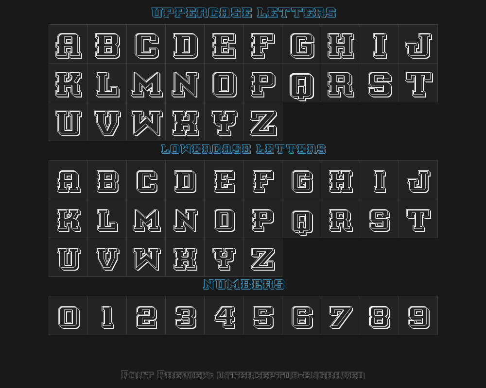interceptor-engraved is a font file with a size of 0.10 MB. The full font name is Interceptor Engraved, Version 2.0; 2016 version. It contains 218 characters, supports 8 Chinese characters. The copyright belongs to Interceptor Engraved. interceptor-engraved font is available for free download, but commercial use requires confirmation on the Interceptor Engraved official website whether it's free for commercial use.