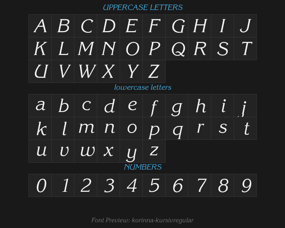 korinna-kursivregular is a font file with a size of 0.03 MB. The full font name is Korinna-KursivRegular, 001.003 version. It contains 228 characters, supports 8 Chinese characters. The copyright belongs to ITC Korinna Kursiv. korinna-kursivregular font is available for free download, but commercial use requires confirmation on the ITC Korinna Kursiv official website whether it's free for commercial use.