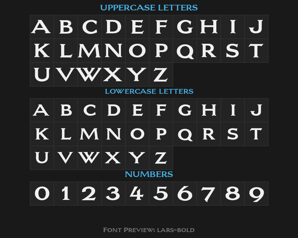 lars-bold is a font file with a size of 0.06 MB. The full font name is Lars-Bold, 1.0 Thu Nov 02 13 25 59 1995 version. It contains 203 characters, supports 8 Chinese characters. The copyright belongs to Lars. lars-bold font is available for free download, but commercial use requires confirmation on the Lars official website whether it's free for commercial use.
