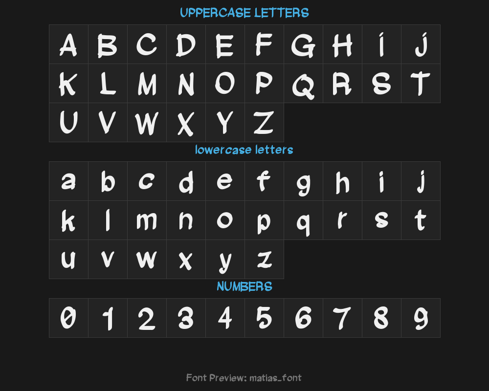 matias-font is a font file with a size of 0.07 MB. The full font name is Matias Font, Version 1.00 August 26, 2014, initial release version. It contains 240 characters, supports 8 Chinese characters. The copyright belongs to Matias Font. matias-font font is available for free download, but commercial use requires confirmation on the Matias Font official website whether it's free for commercial use.