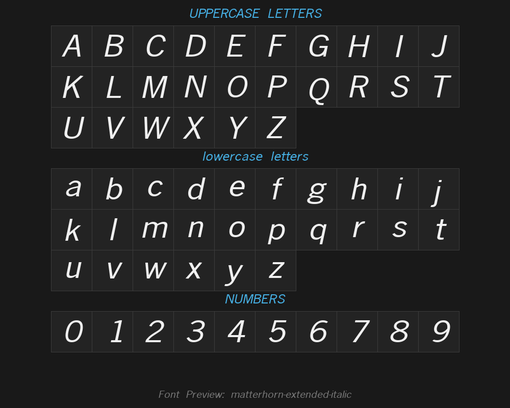 matterhorn-extended-italic is a font file with a size of 0.05 MB. The full font name is Matterhorn-Extended Italic, 1.0 1995 2.0 2001 version. It contains 217 characters, supports 8 Chinese characters. The copyright belongs to Matterhorn-Extended. matterhorn-extended-italic font is available for free download, but commercial use requires confirmation on the Matterhorn-Extended official website whether it's free for commercial use.