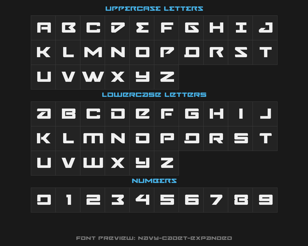 navy-cadet-expanded is a font file with a size of 0.03 MB. The full font name is Navy Cadet Expanded, Version 1.0; 2015 version. It contains 223 characters, supports 8 Chinese characters. The copyright belongs to Navy Cadet Expanded. navy-cadet-expanded font is available for free download, but commercial use requires confirmation on the Navy Cadet Expanded official website whether it's free for commercial use.
