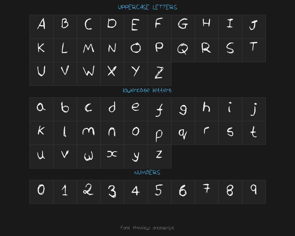 orcascript is a font file with a size of 0.02 MB. The full font name is OrcaScript, Version 001.000 version. It contains 140 characters, supports 8 Chinese characters. The copyright belongs to OrcaScript. orcascript font is available for free download, but commercial use requires confirmation on the OrcaScript official website whether it's free for commercial use.