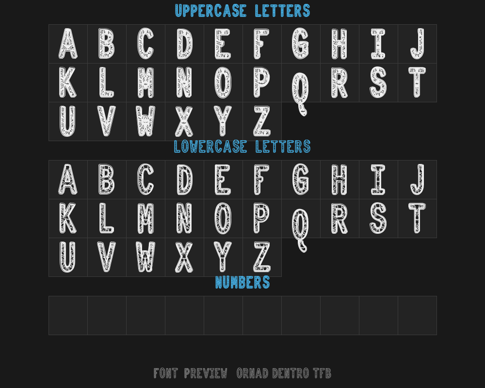 ornad-dentro-tfb is a font file with a size of 0.27 MB. The full font name is ORNAD dentro tfb, Version 1.00 January 14, 2013, initial release version. It contains 240 characters, supports 8 Chinese characters. The copyright belongs to ORNAD dentro tfb. ornad-dentro-tfb font is available for free download, but commercial use requires confirmation on the ORNAD dentro tfb official website whether it's free for commercial use.