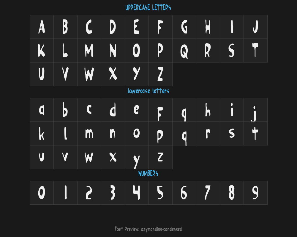 ozymandias-condensed is a font file with a size of 0.04 MB. The full font name is Ozymandias Condensed, 1 version. It contains 101 characters, supports 8 Chinese characters. The copyright belongs to Ozymandias Condensed. ozymandias-condensed font is available for free download, but commercial use requires confirmation on the Ozymandias Condensed official website whether it's free for commercial use.
