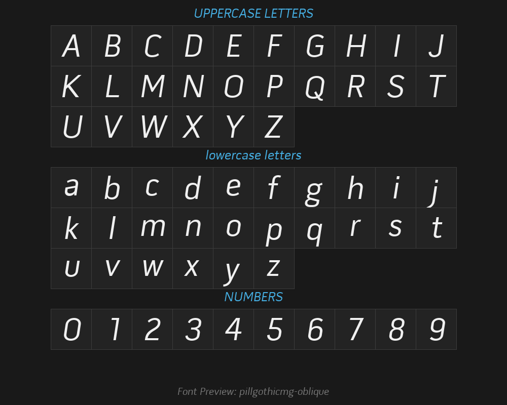 pillgothic600mg-oblique is a font file with a size of 0.08 MB. The full font name is PillGothic600mg-Oblique, Version 1.000 2004 initial release version. It contains 307 characters, supports 8 Chinese characters. The copyright belongs to Pill Gothic 600mg Rg. pillgothic600mg-oblique font is available for free download, but commercial use requires confirmation on the Pill Gothic 600mg Rg official website whether it's free for commercial use.