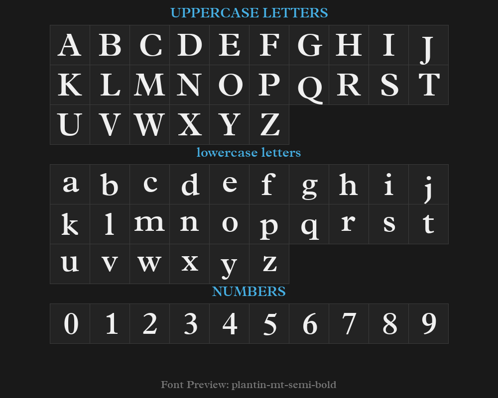 plantin-mt-semi-bold is a font file with a size of 0.05 MB. The full font name is Plantin MT Semi Bold, Version 2 - January 2001 version. It contains 250 characters, supports 8 Chinese characters. The copyright belongs to Plantin MT Semi Bold. plantin-mt-semi-bold font is available for free download, but commercial use requires confirmation on the Plantin MT Semi Bold official website whether it's free for commercial use.