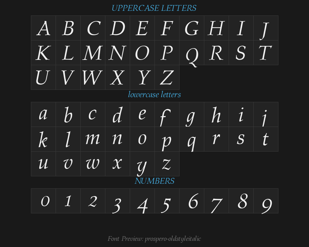 prospero-oldstyleitalic is a font file with a size of 0.05 MB. The full font name is Prospero OldstyleItalic, Altsys Fontographer 4.0.3 22.03.1995 version. It contains 243 characters, supports 8 Chinese characters. The copyright belongs to Prospero. prospero-oldstyleitalic font is available for free download, but commercial use requires confirmation on the Prospero official website whether it's free for commercial use.