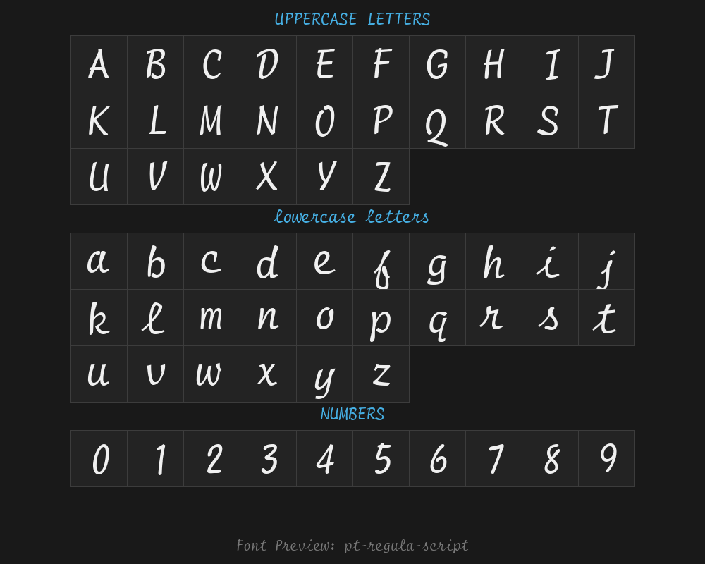 pt-regula-script is a font file with a size of 0.06 MB. The full font name is PT Regula Script, 1.0 Mon May 03 15 19 31 1993 version. It contains 228 characters, supports 8 Chinese characters. The copyright belongs to PT Regula Script. pt-regula-script font is available for free download, but commercial use requires confirmation on the PT Regula Script official website whether it's free for commercial use.