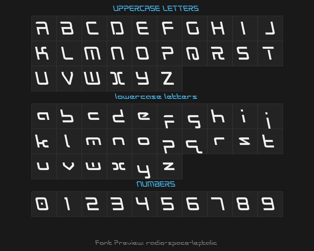 radio-space-leftalic is a font file with a size of 0.02 MB. The full font name is Radio Space Leftalic, Version 3.0; 2015 version. It contains 220 characters, supports 8 Chinese characters. The copyright belongs to Radio Space Leftalic. radio-space-leftalic font is available for free download, but commercial use requires confirmation on the Radio Space Leftalic official website whether it's free for commercial use.