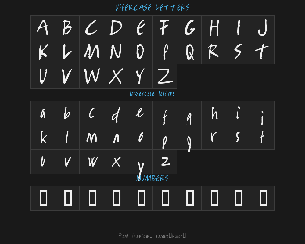 rambo-killer- is a font file with a size of 0.02 MB. The full font name is Rambo Killer, Macromedia Fontographer 4.1 1997-11-21 version. It contains 59 characters, supports 8 Chinese characters. The copyright belongs to Rambo Killer. rambo-killer- font is available for free download, but commercial use requires confirmation on the Rambo Killer official website whether it's free for commercial use.