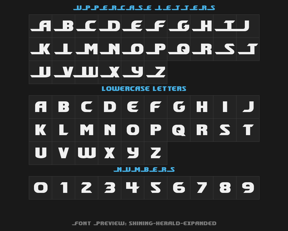 shining-herald-expanded is a font file with a size of 0.03 MB. The full font name is Shining Herald Expanded, Version 1.0; 2013 version. It contains 219 characters, supports 8 Chinese characters. The copyright belongs to Shining Herald Expanded. shining-herald-expanded font is available for free download, but commercial use requires confirmation on the Shining Herald Expanded official website whether it's free for commercial use.