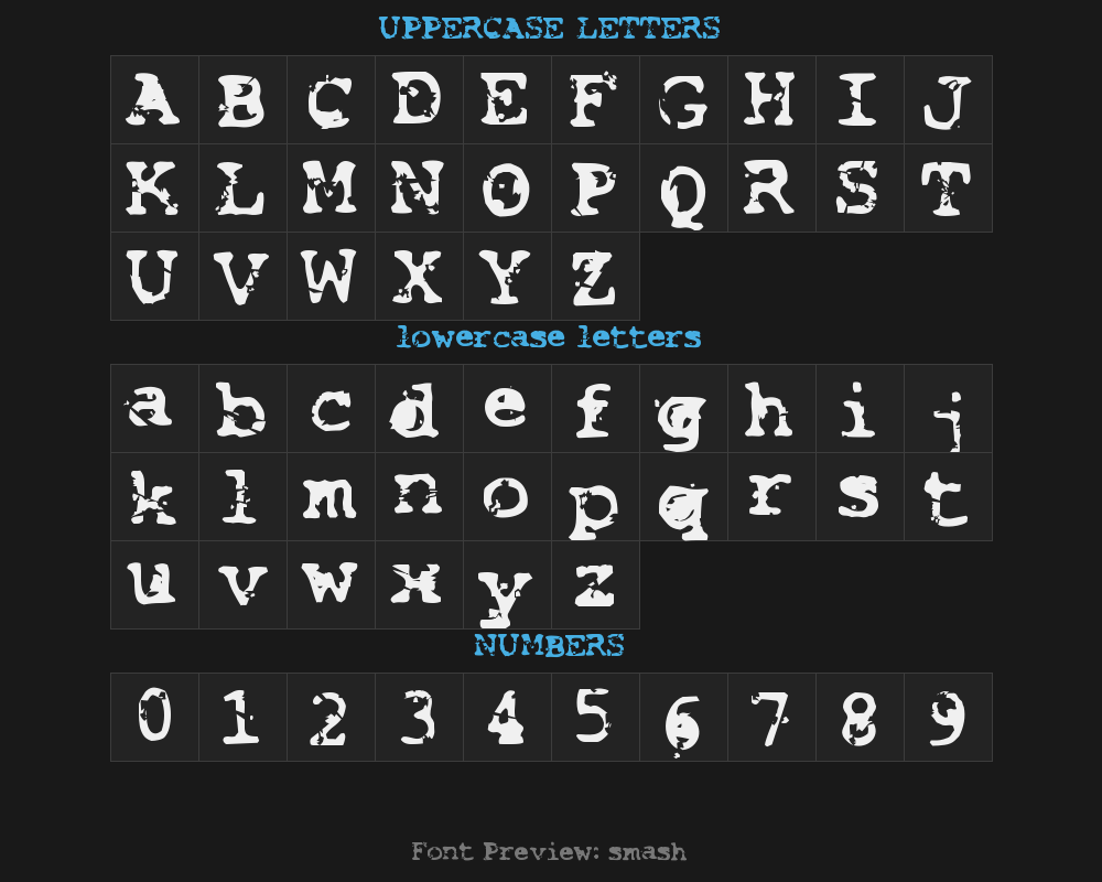 smash is a font file with a size of 0.05 MB. The full font name is Smash, 1.0 version. It contains 114 characters, supports 8 Chinese characters. The copyright belongs to Smash. smash font is available for free download, but commercial use requires confirmation on the Smash official website whether it's free for commercial use.
