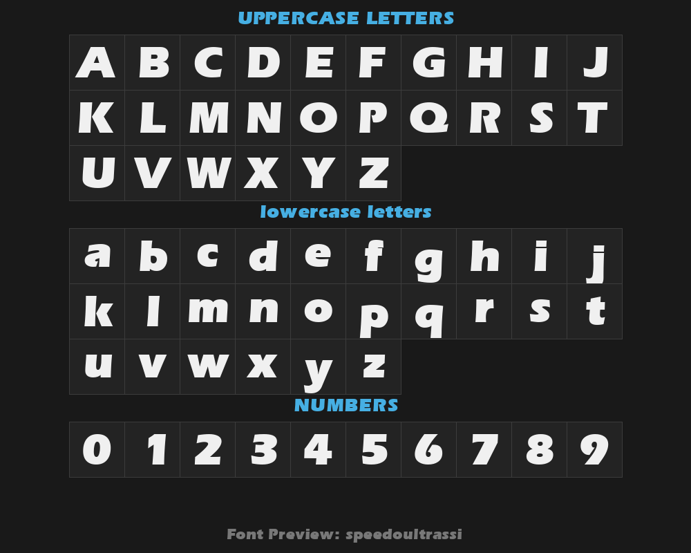 speedoultrassi is a font file with a size of 0.05 MB. The full font name is SpeedoUltraSSi, Macromedia Fontographer 4.1 8 8 95 version. It contains 234 characters, supports 8 Chinese characters. The copyright belongs to SpeedoUltraSSi. speedoultrassi font is available for free download, but commercial use requires confirmation on the SpeedoUltraSSi official website whether it's free for commercial use.