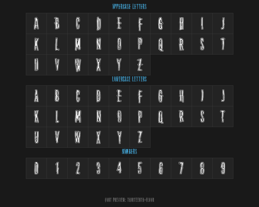thirteenth-floor is a font file with a size of 0.08 MB. The full font name is Thirteenth Floor, Version 1.00 September 22, 2015, initial release version. It contains 653 characters, supports 8 Chinese characters. The copyright belongs to Thirteenth Floor. thirteenth-floor font is available for free download, but commercial use requires confirmation on the Thirteenth Floor official website whether it's free for commercial use.