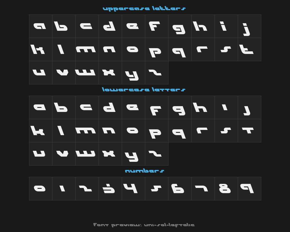 uni-sol-leftalic is a font file with a size of 0.04 MB. The full font name is uni-sol leftalic, 3 version. It contains 218 characters, supports 8 Chinese characters. The copyright belongs to uni-sol leftalic. uni-sol-leftalic font is available for free download, but commercial use requires confirmation on the uni-sol leftalic official website whether it's free for commercial use.