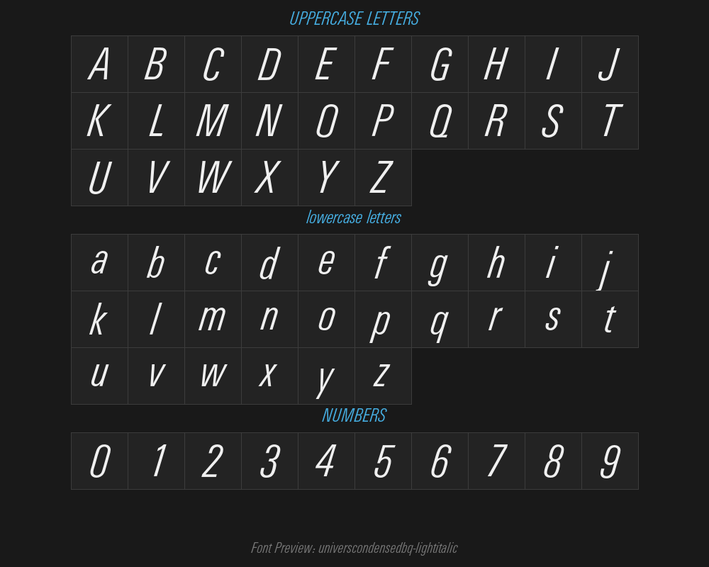 | AboutFont | Univers Condensed 48 Light Italic 1177942311 |