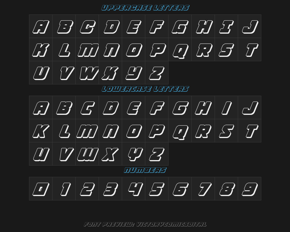 victorycomics3dital is a font file with a size of 0.08 MB. The full font name is Victory Comics 3D Italic, Version 1.0; 2017 version. It contains 218 characters, supports 8 Chinese characters. The copyright belongs to Victory Comics 3D Italic. victorycomics3dital font is available for free download, but commercial use requires confirmation on the Victory Comics 3D Italic official website whether it's free for commercial use.